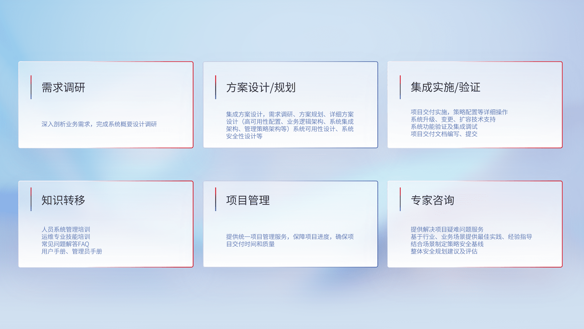 针对客户行业特性,,,,将宏观的安全战略和需求,,,,通过专业的交付服务,,,,实现项目落地,,,为客户提供标准规范的集成交付服务。。。。